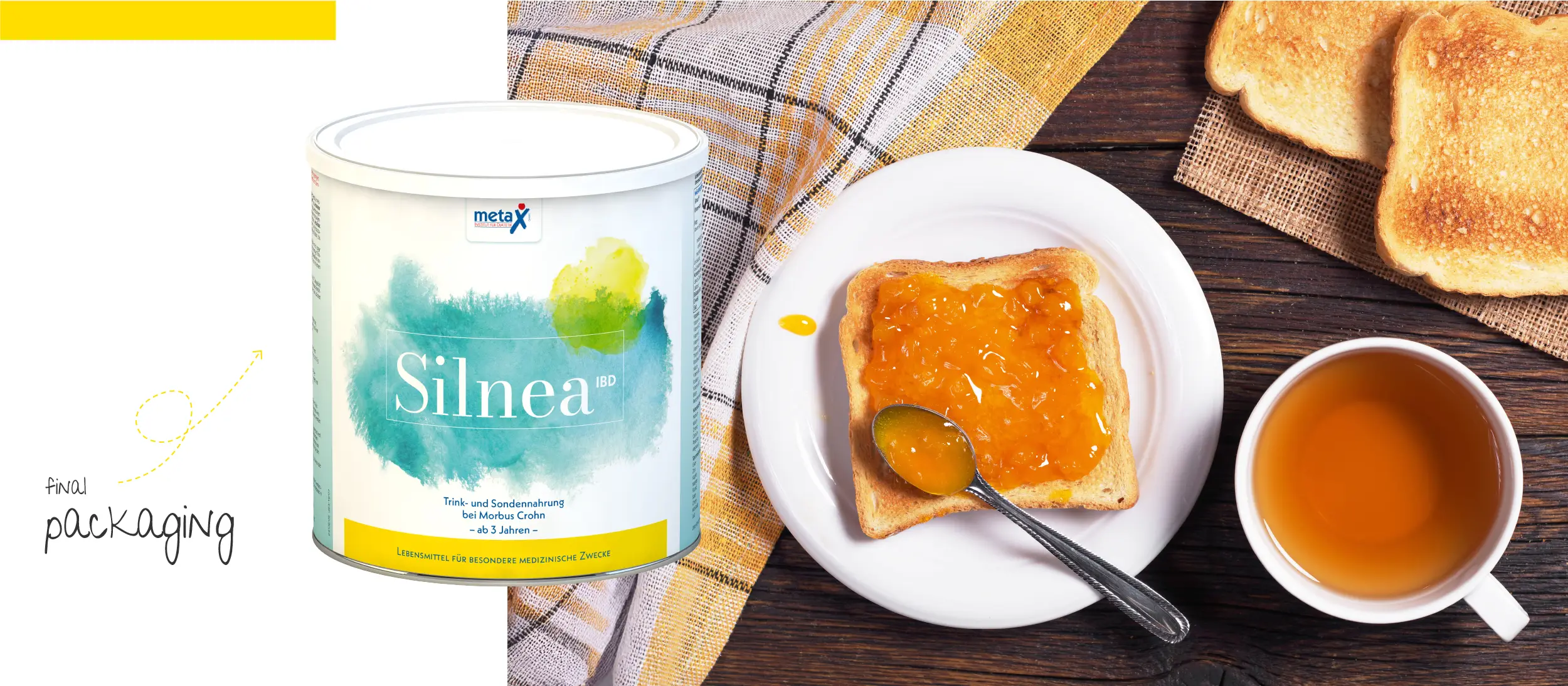 art direction + packaging design + graphic designSilnea IBD is a cutting-edge powdered formula designed for the dietary management of Crohn’s disease, created by metaX—a forward-thinking company.